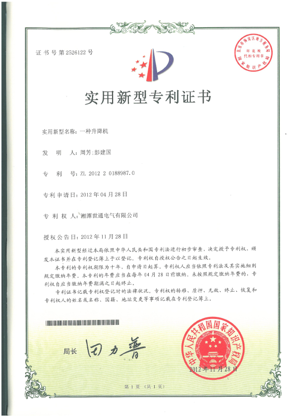 ◆ 本公司塔筒專用升降機(jī)獲得多項國家專利